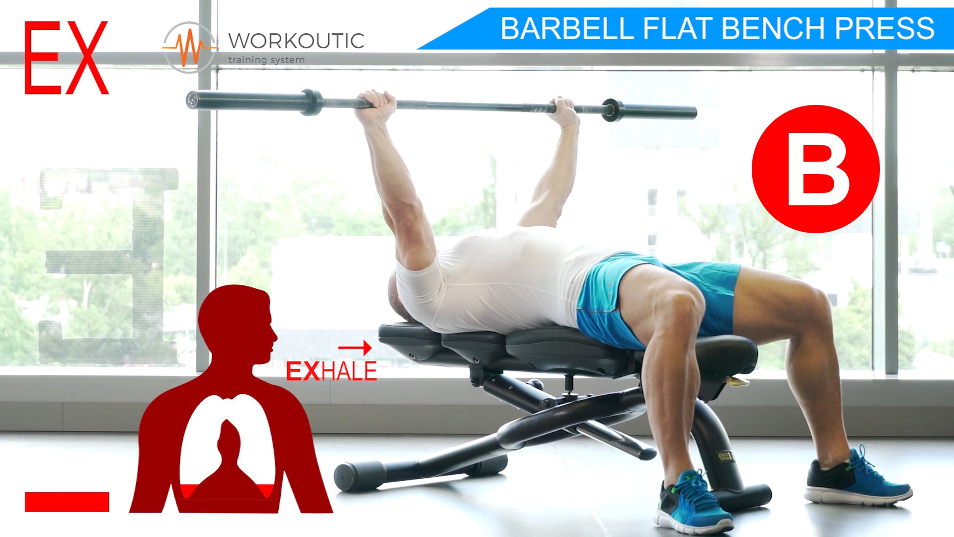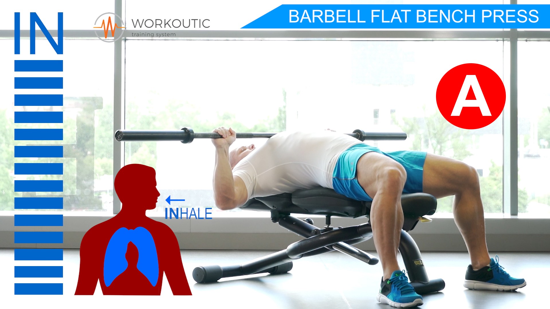 Dole - Nádych , Hore - Výdych. Nadychujeme sa smerom nadol, keď spúštame činku na hrudnú kost. V momente keď sa nám dotkne os činky hrude, začneme vydychovať a vytláčať činku smerom hore.